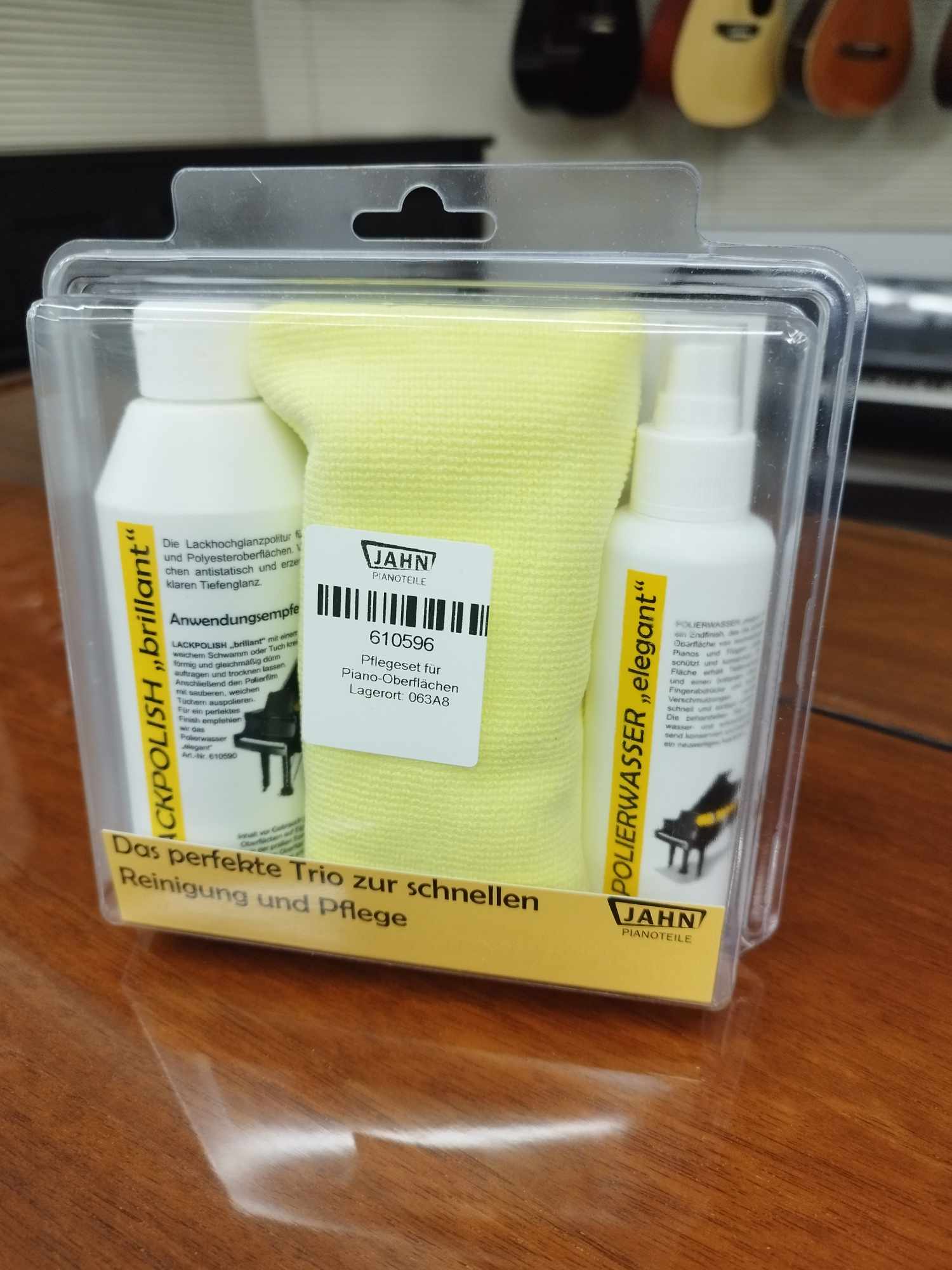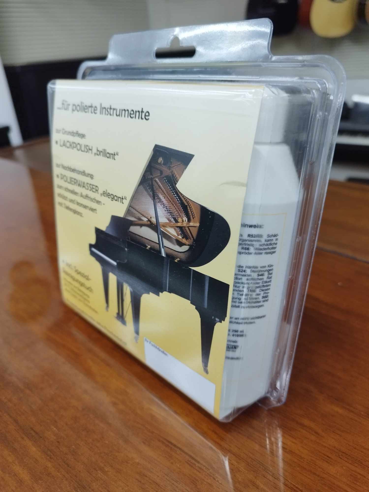 Σετ καθαρισμού & γυαλίσματος κατάλληλο για λακαριστές και πολυεστερικές επιφάνειες πιάνων. Το σετ αποτελείται από: 1 αλοιφή "brillant" που αφαιρεί ελαφριές γρατζουνιές, 1 καθαριστικό - γυαλιστικό υγρό "elegant" που προστατεύει και διατηρεί την γυαλάδα του πιάνου, 1 ειδικό πανί γυαλίσματος. Χώρα προέλευσης: Γερμανία. Περιεχόμενο: 250ml + 125ml.